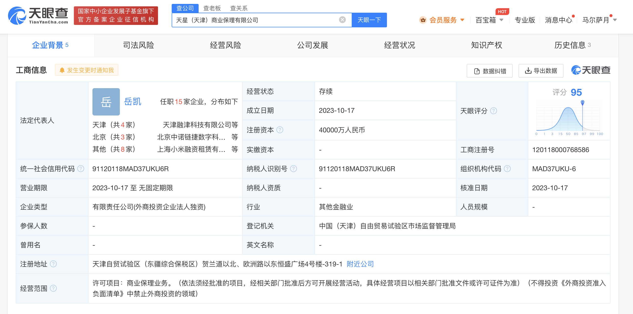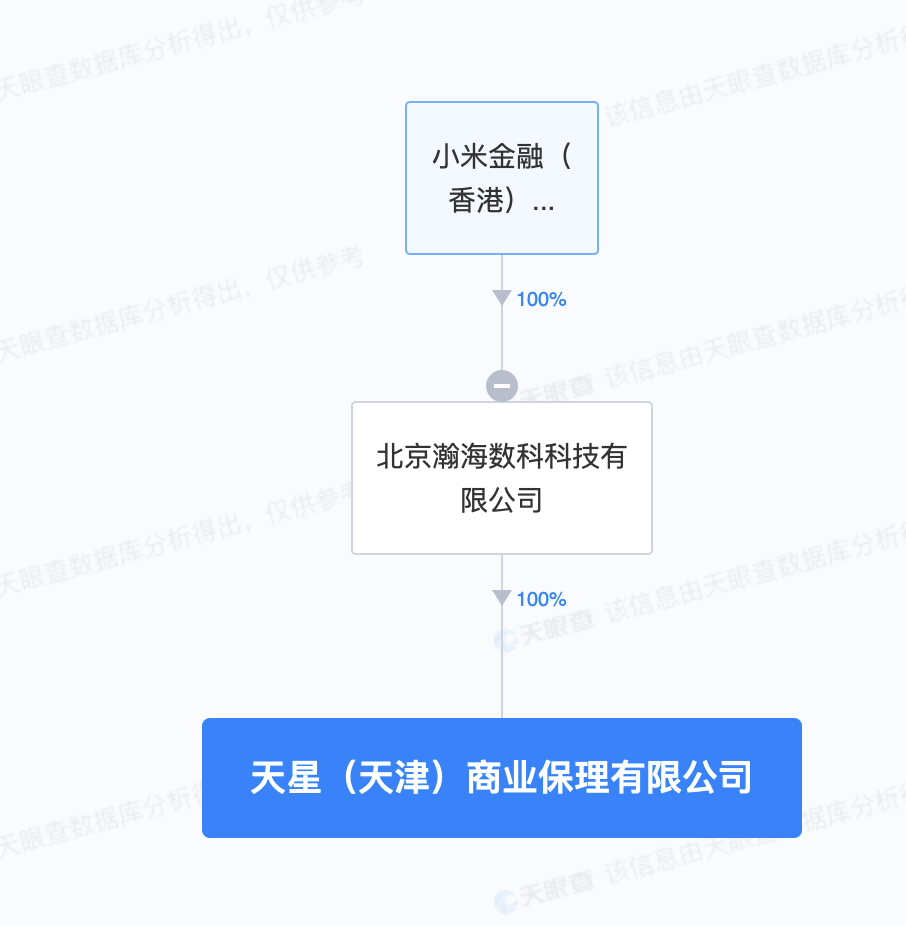 南方财经10月23日电,天眼查App显示,近日,天星 (天津)商业保理有限公司成立,法定代表人为岳凯,注册资本4亿人民币,经营范围为商业保理业务。股权全景穿透图显示,该公司由小米金融(香港)有限公司(XIAOMI FINANCE H·K·LIMITED)间接全资持股。
