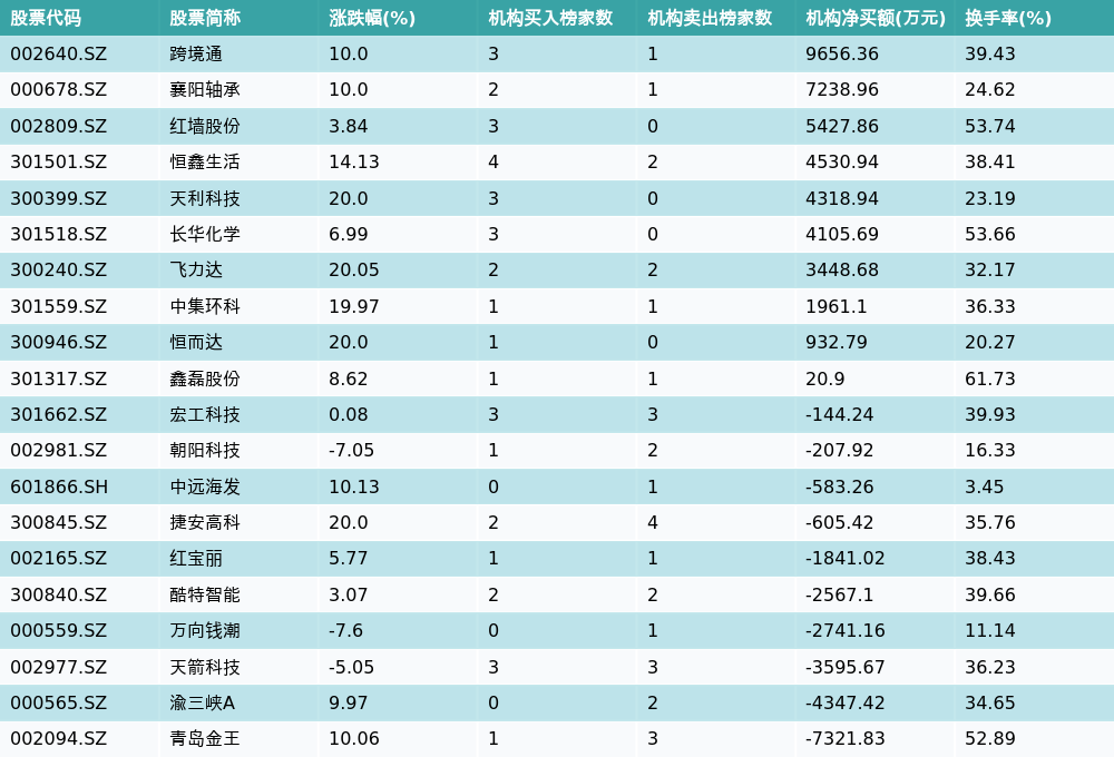 南财智讯5月14日电,南财金融终端数据显示,因当日异动登上龙虎榜的个股中,20只沪深A股龙虎榜出现了机构的身影,机构合计净买入17687.18万元,具体来看,机构净买入10只个股,净卖出10只个股。其中,机构净买入前三分别为跨境通(002640.SZ)、襄阳轴承(000678.SZ)与红墙股份(002809.SZ),详情见下图:机构净卖出的个股中,前三分别为青岛金王(002094.SZ)、渝三峡A(000565.SZ)与天箭科技(002977.SZ)。