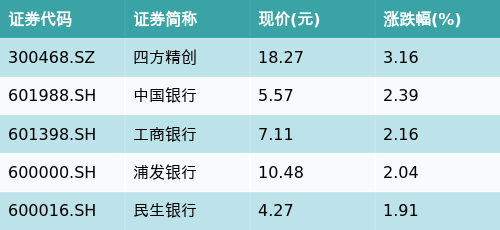 截至午间收盘,跨境支付(CIPS)主题涨跌幅最高的五只股票为:四方精创(300468.SZ)、中国银行(601988.SH)、工商银行(601398.SH)、浦发银行(600000.SH)与民生银行(600016.SH)。详情见下表: