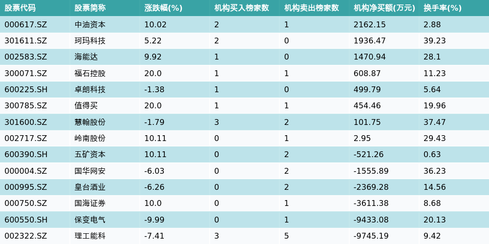 南方财经9月25日电,南财金融终端数据显示,因当日异动登上龙虎榜的个股中,14只沪深A股龙虎榜出现了机构的身影,机构合计净卖出19998.7万元,具体来看,机构净买入8只个股,净卖出6只个股。其中,机构净买入前三分别为中油资本(000617.SZ)、珂玛科技(301611.SZ)与海能达(002583.SZ),详情见下图: