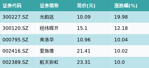 截至收盘,苹果概念主题涨跌幅最高的五只股票为:光韵达(300227.SZ)、经纬辉开(300120.SZ)、英洛华(000795.SZ)、爱施德(002416.SZ)与航天彩虹(002389.SZ)。详情见下表: