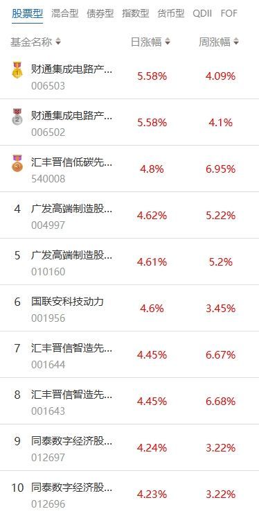 南方财经7月9日电,根据南财基金通数据:2025年07月08日当日收益靠前的股票型基金包括:财通集成电路产业股票型证券投资基金(006503,日收益5.58%);汇丰晋信低碳先锋股票型证券投资基金(540008,日收益4.8%);广发高端制造股票型发起式证券投资基金(004997,日收益4.62%)等。收益较低的股票型基金包括:红土创新医疗保健股票型发起式证券投资基金(010434,日收益-2.43%);金鹰医疗健康产业股票型证券投资基金(004041,日收益-1.91%);富国医药成长30股票型证券投资基金(009162,日收益-1.9%)等。