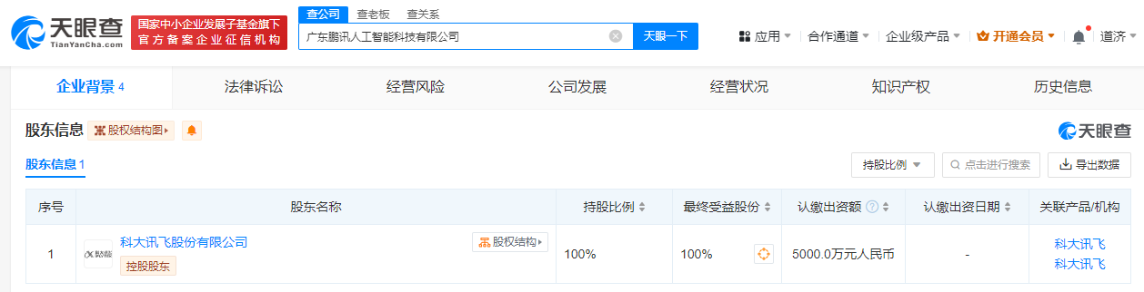 科大讯飞在广东成立AI公司 注册资本5000万