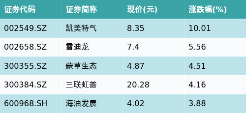 截至收盘,碳中和主题涨跌幅最高的五只股票为:凯美特气(002549.SZ)、雪迪龙(002658.SZ)、蒙草生态(300355.SZ)、三联虹普(300384.SZ)与海油发展(600968.SH)。详情见下表: