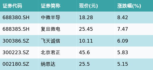 截至收盘,MCU芯片主题涨跌幅最高的五只股票为:中微半导(688380.SH)、复旦微电(688385.SH)、飞天诚信(300386.SZ)、北京君正(300223.SZ)与纳思达(002180.SZ)。详情见下表: