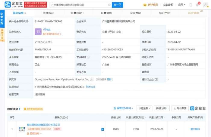 南方财经4月7日电,企查查APP显示,4月2日,广州番禺爱尔眼科医院有限公司成立,法定代表人为何伟亮,注册资本2100万元人民币,经营范围包含:医疗服务。企查查股权穿透显示,该公司由爱尔眼科(300015)100%控股。(南方财经 彭卓)