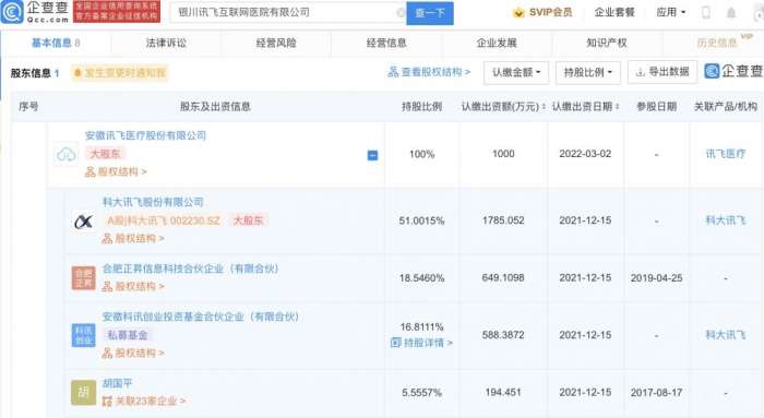 南方财经3月21日电,企查查APP显示,3月16日,银川讯飞互联网医院有限公司成立,法定代表人为赵志伟,注册资本1000万元人民币,经营范围包含:医疗服务;依托实体医院的互联网医院服务;互联网信息服务;基础电信业务;药品零售等。企查查股权穿透显示,该公司由安徽讯飞医疗股份有限公司100%控股,后者由科大讯飞(002230)持股51%。(南方财经 胡琳)