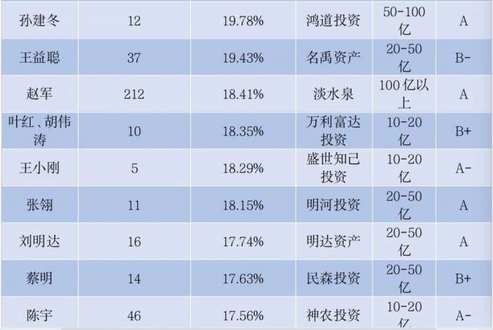 南方财经1月24日电,据私募排排网统计,截至12月底,公司管理规模在5亿元以上,基金经理当月更新业绩的产品在3只及以上,近十年年化收益超过10%的私募基金经理共计33人,其中有5位为百亿级别的私募基金经理,分别是林园投资林园、景林资产蒋彤、淡水泉赵军、星石投资江晖、重阳投资裘国根与陈心。此外,近十年年化收益超过20%的私募基金经理有7位,分别是林园投资林园、新思哲投资韩广斌、格林施通余军、恒复投资刘强、景林资产蒋彤、易鑫安资管栾鑫、混沌道然资产王歆,其中林园与蒋彤为百亿私募基金经理。