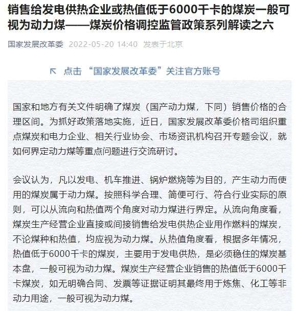 南方财经5月20日电,国家和地方有关文件明确了煤炭(国产动力煤,下同)销售价格的合理区间。为抓好政策落地实施,近日,国家发展改革委价格司组织重点煤炭和电力企业、相关行业协会、市场资讯机构召开专题会议,就如何界定动力煤等重点问题进行交流研讨。会议认为,凡以发电、机车推进、锅炉燃烧等为目的,产生动力而使用的煤炭属于动力煤。按照科学合理、简便可行、符合行业实际的原则,可以从流向和热值两个角度对动力煤进行界定。从流向角度看,煤炭生产经营企业直接或间接销售给发电供热企业用作燃料的煤炭,不论煤种和热值,均应视为动力煤。从热值角度看,根据多年情况,热值低于6000千卡的煤炭,主要用于发电供热,是必须稳住的煤炭基本盘,一般可视为动力煤。煤炭生产经营企业销售的热值低于6000千卡煤炭,如无明确合同、发票等证据证明其最终用于炼焦、化工等非动力用途,一般可视为动力煤。(国家发展改革委)