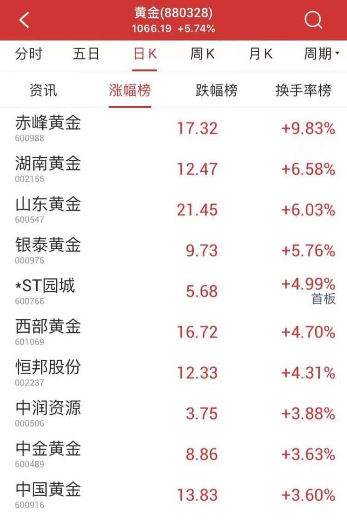 南方财经3月7日电,A股早盘走弱,黄金概念股逆势走强,赤峰黄金拉升触板,湖南黄金、山东黄金、银泰黄金、西部黄金等涨超5%。(南方财经 万倩倩)