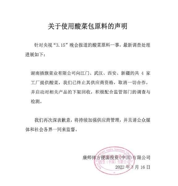 康师傅再致歉:相关产品下架回收,终止插旗菜业供应商资格