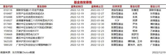 南方财经12月19日电,据东方财富Choice数据统计,今日共有11只基金首发募集(A/C类分开计算);包括7只股票型基金,2只混合型基金,1只债券型基金和1只FOF。