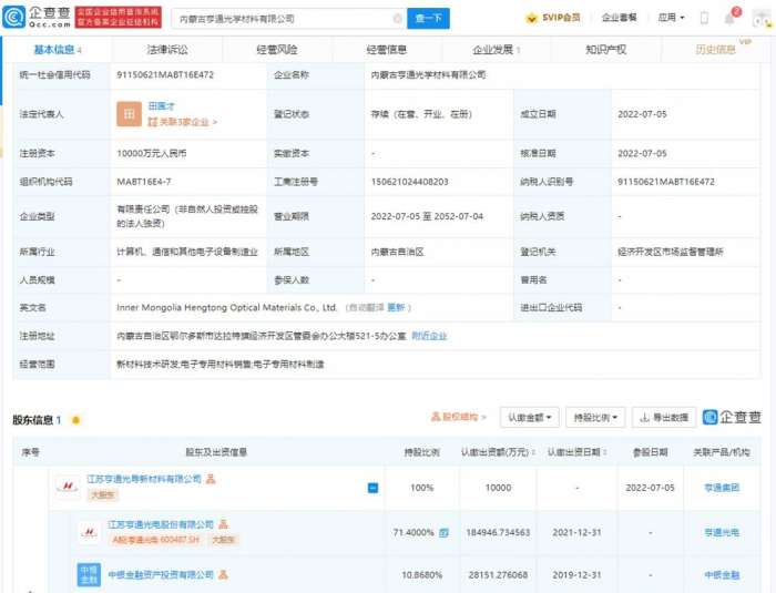 亨通光电于内蒙古投资成立光学材料公司,注册资本1亿元
