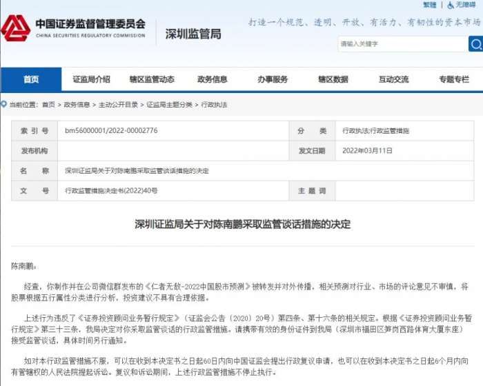 因投资建议不具有合理依据,深圳证监局对陈南鹏采取监管谈话的行政监管措施