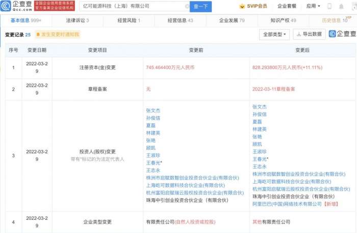 南方财经3月30日电,企查查APP显示,3月29日,亿可能源科技(上海)有限公司发生工商变更,新增股东阿里巴巴(中国)网络技术有限公司,同时公司注册资本由745.46万元人民币增加至828.29万元人民币,增幅11.11%。企查查信息显示,该公司成立于2014年,法定代表人为王春光,经营范围包含:节能管理服务;碳减排、碳转化、碳捕捉、碳封存技术研发等。据其官网,亿可能源是一家工业智能科技公司。(南方财经 彭卓)
