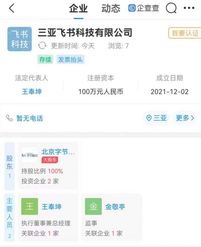 字节跳动于三亚成立飞书科技公司,经营范围含电子产品销售等