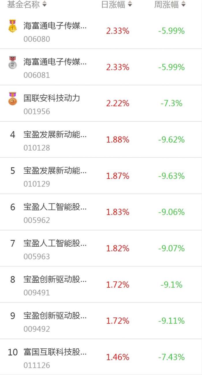 南方财经3月10日电,根据南财基金通数据:2022年3月9日当日收益较高的股票型基金包括:海富通电子信息传媒产业股票型证券投资基金(006080,日收益2.33%);国联安科技动力股票型证券投资基金(001956,日收益2.22%);宝盈发展新动能股票型证券投资基金(010128,日涨幅1.88%)等。收益较低的股票型基金包括:工银瑞信医药健康行业股票型证券投资基金(006003,日收益-3.10%);中欧医疗创新股票型证券投资基金(006229,日收益-3.01%);嘉实医疗保健股票型证券投资基金(000711,日收益-2.99%)等。