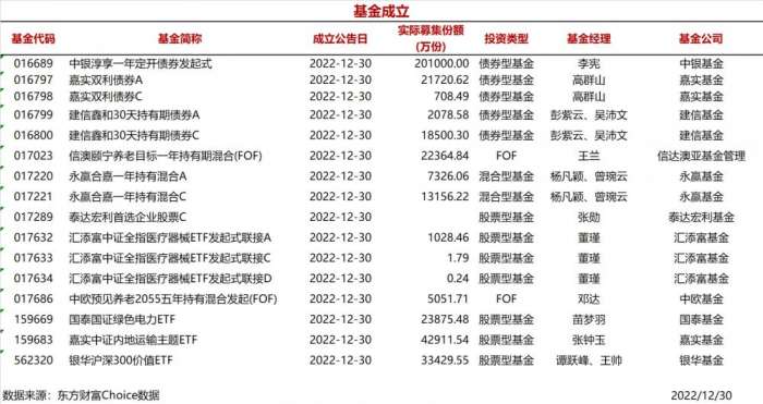 南方财经12月30日电,据东方财富Choice数据统计,今日共有16只基金公告成立(A/C类分开计算),包括7只股票型基金,5只债券型基金,2只混合型基金和2只FOF。