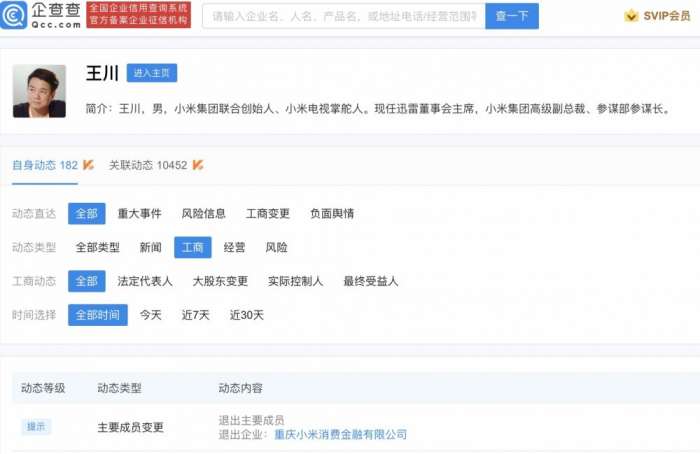 南方财经3月10日电,企查查APP显示,近日,重庆小米消费金融有限公司发生工商变更,小米联合创始人王川退出董事职位,新增季春江为董事。企查查信息显示,该公司成立于2020年,法定代表人为洪锋,注册资本15亿元人民币,经营范围包含:发放个人消费贷款;接受股东境内子公司及境内股东的存款;向境内金融机构借款;与消费金融相关的咨询、代理业务等。(南方财经 胡琳)