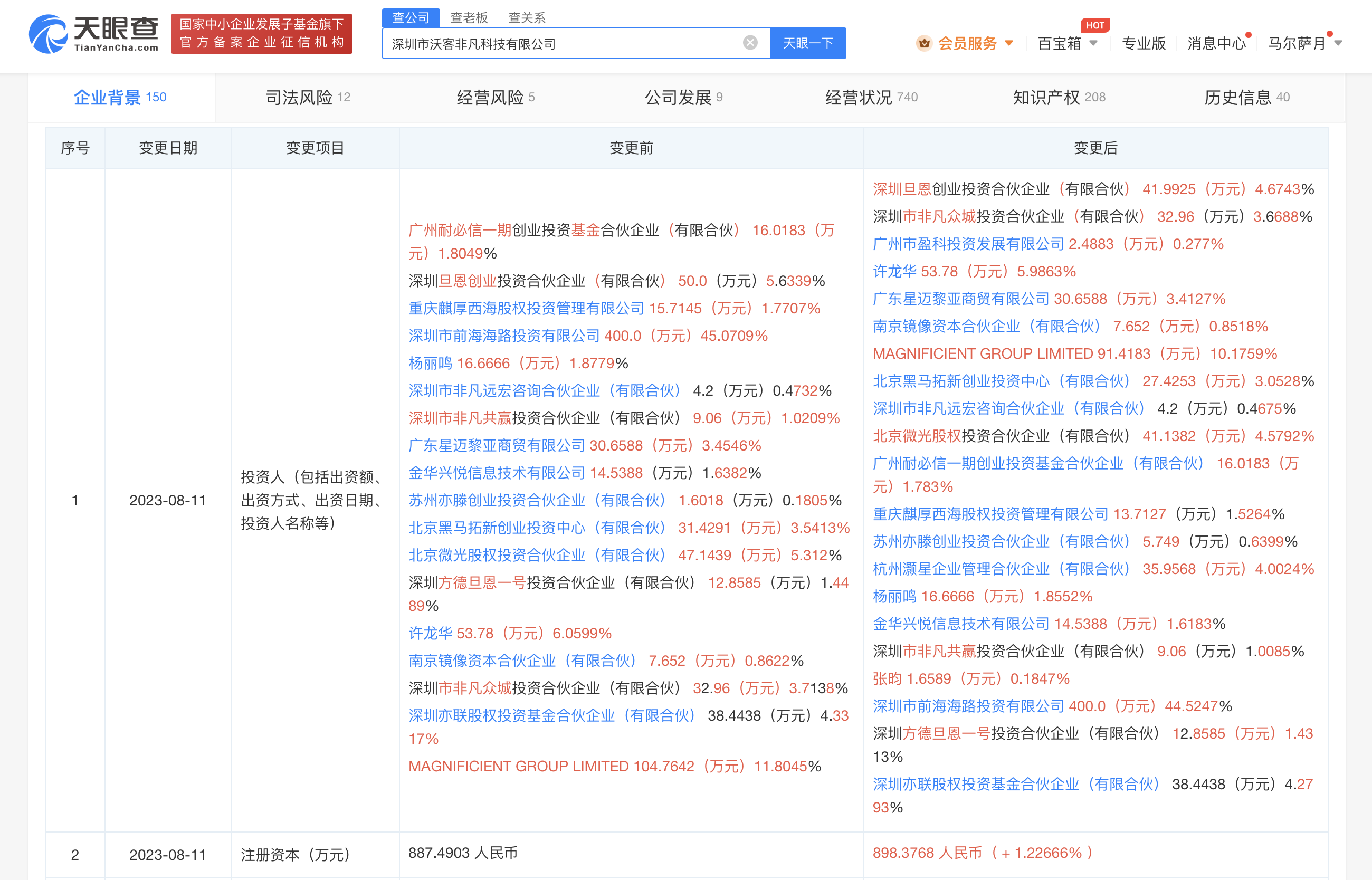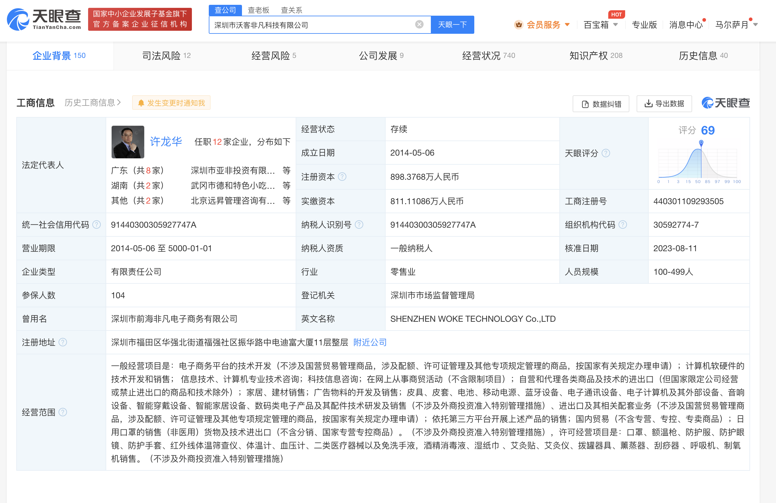 南方财经8月14日电,天眼查App显示,近日,跨境出口电商WOOK关联公司深圳市沃客非凡科技有限公司发生工商变更,股东新增阿里旗下杭州灏星企业管理合伙企业(有限合伙)、广州市盈科投资发展有限公司、张昀。同时,注册资本由约887.49万人民币增至约898.38万人民币。该公司成立于2014年5月,法定代表人为许龙华,经营范围含电子商务平台的技术开发、计算机软硬件的技术开发和销售、自营和代理各类商品及技术的进出口等。