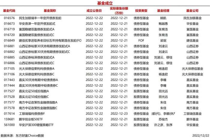 南方财经12月22日电,据东方财富Choice数据统计,今日共有20只基金公告成立(A/C类分开计算),包括15只债券型基金,4只股票型基金和1只FOF。