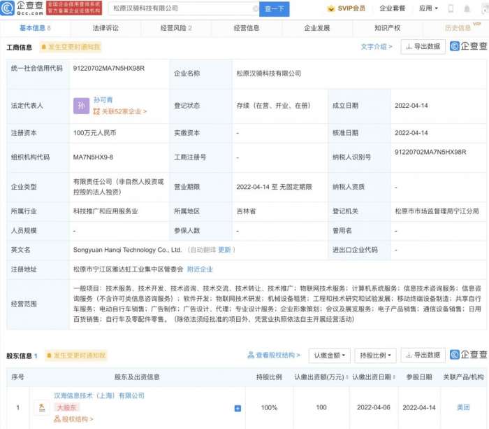 南方财经4月24日电,企查查APP显示,近日,松原汉骑科技有限公司成立,法定代表人为孙可青,注册资本100万元人民币,经营范围包含:物联网技术研发;移动终端设备制造;共享自行车服务;电动自行车销售等。企查查股权穿透显示,该公司由美团关联公司汉海信息技术(上海)有限公司100%控股。(南方财经 彭卓)