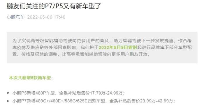南方财经5月6日电,小鹏汽车微信公众号宣布P5/P7推出新车型。其中,小鹏P5新增460P车型,全系补贴后售价17.79万-24.99万;小鹏P7新增480G+/480E+/586G/625E四款车型,全系补贴后售价23.99万-42.99万。小鹏汽车表示,除P5和P7车系配置和价格调整外,小鹏汽车品牌充电服务权益也将进行变更。自5月9日零时起,购买小鹏G3i、P5和P7的用户不再享受终身免费充电和免费家用充电桩及安装的权益。(南方财经 方楚槟)