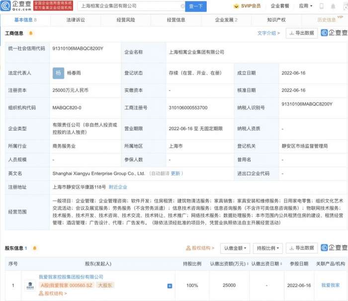 南方财经6月16日电,企查查APP显示,6月16日,上海相寓企业集团有限公司成立,法定代表人杨春雨,注册资本2.5亿元人民币,经营范围包含:企业管理;企业管理咨询;软件开发;住房租赁;建筑物清洁服务等。企查查股权穿透显示,该公司由我爱我家(000560)100%控股。(南方财经 彭卓)