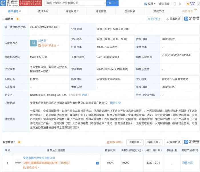 海螺水泥1亿元于合肥设控股公司 经营范围含汽车零配件批发