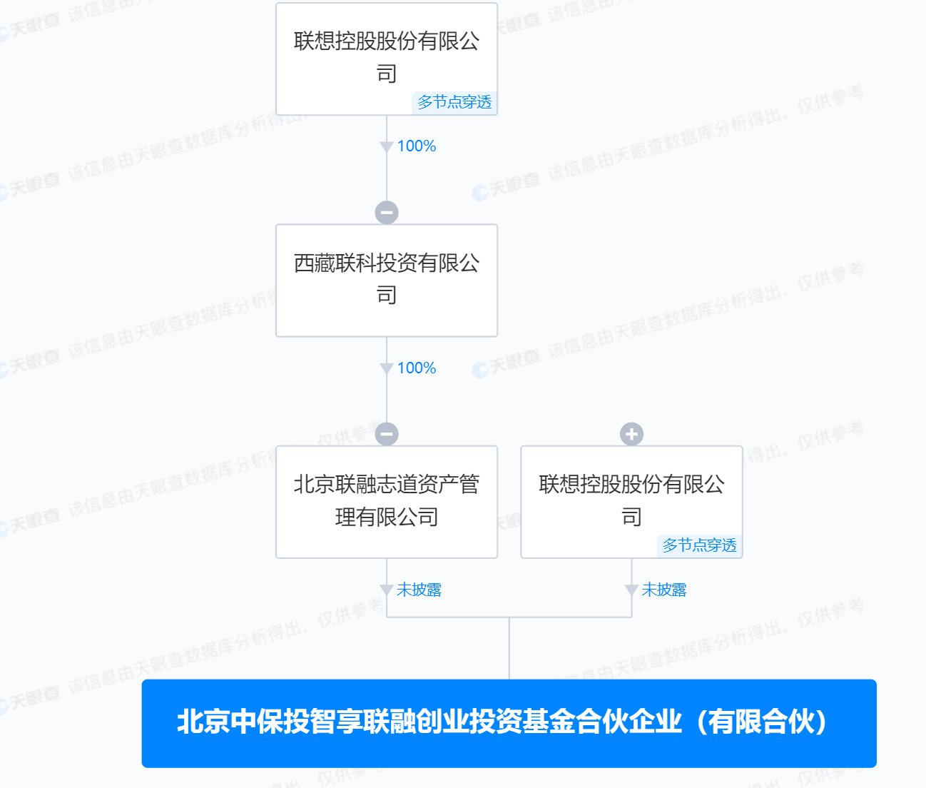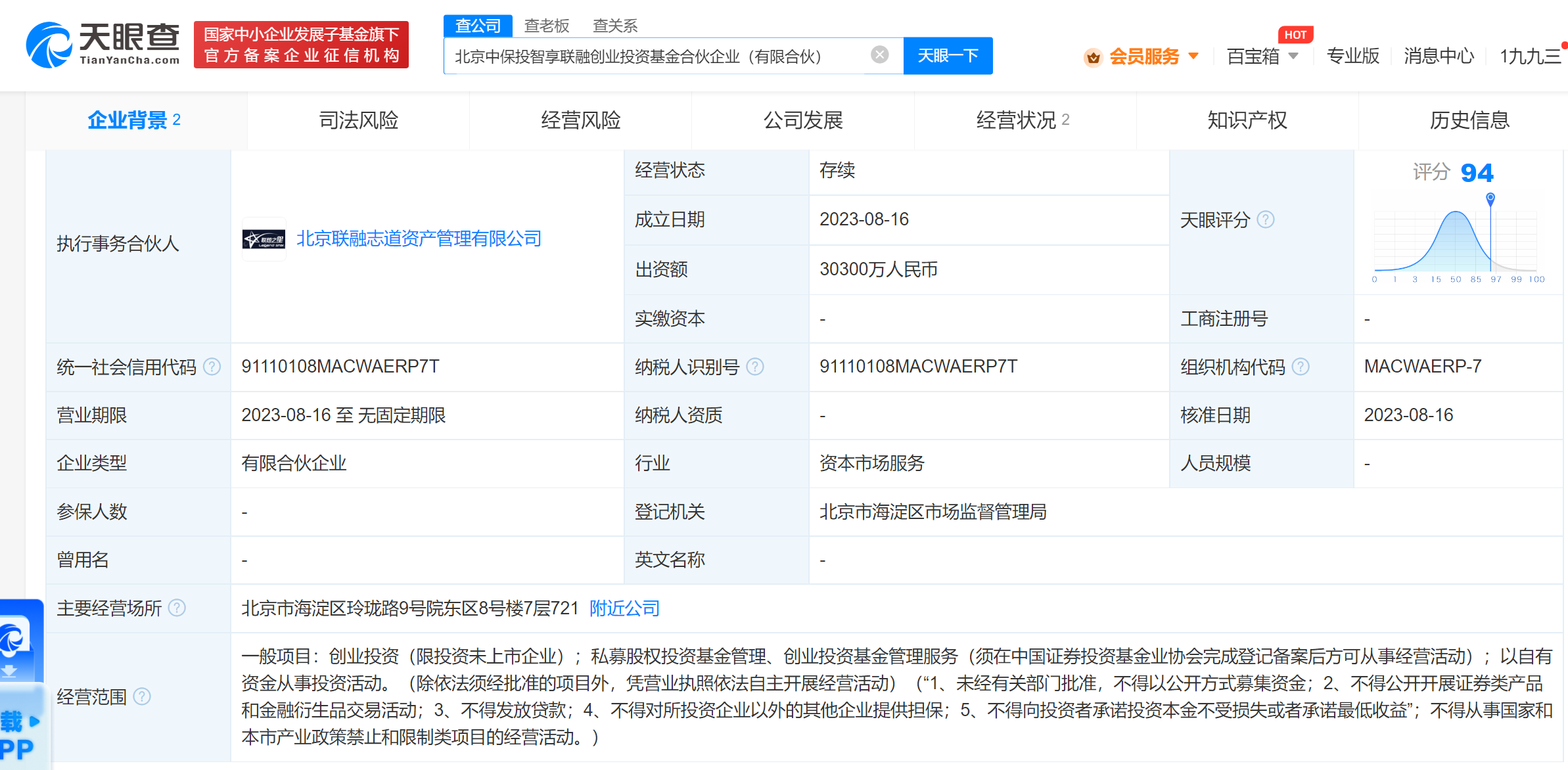 南方财经8月22日电,天眼查App显示,近日,北京中保投智享联融创业投资基金合伙企业(有限合伙)成立,执行事务合伙人为北京联融志道资产管理有限公司,出资额3.03亿人民币,经营范围含创业投资、私募股权投资基金管理、创业投资基金管理服务、以自有资金从事投资活动。股权全景穿透图显示,该合伙企业由联想控股股份有限公司及其旗下北京联融志道资产管理有限公司共同出资。