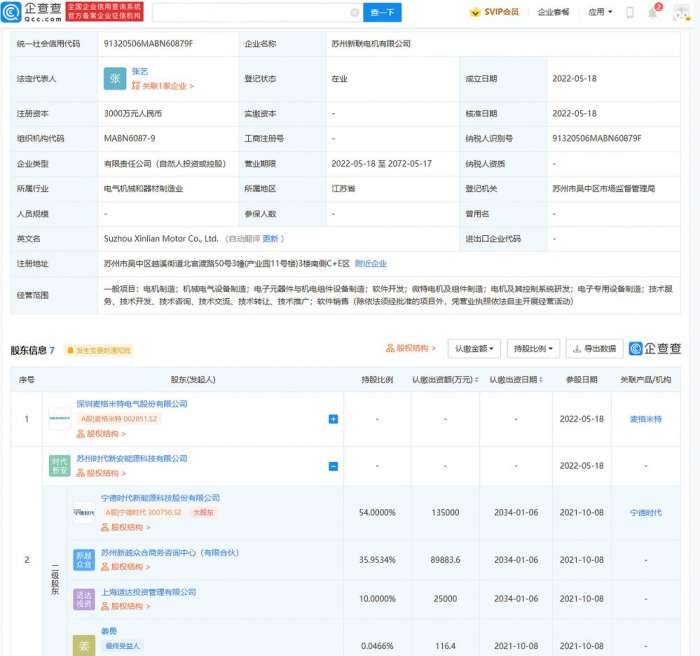 南方财经5月24日电,企查查APP显示,5月18日,苏州新联电机有限公司成立,法定代表人为张艺,注册资本3000万元人民币,经营范围包含:电机制造;机械电气设备制造;电子元器件与机电组件设备制造;微特电机及组件制造;电机及其控制系统研发等。企查查股权穿透显示,该公司由麦格米特(002851)、宁德时代(300750)子公司苏州时代新安能源科技有限公司等共同持股。(南方财经 彭卓)