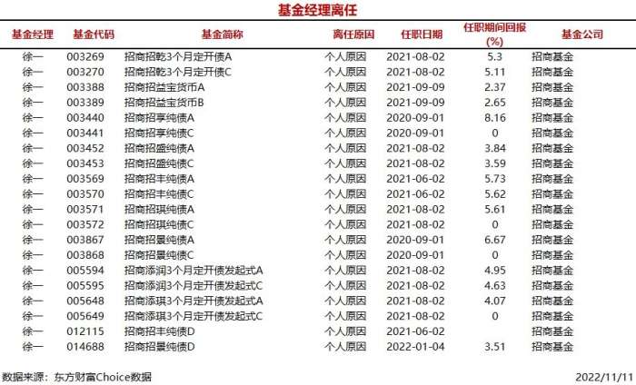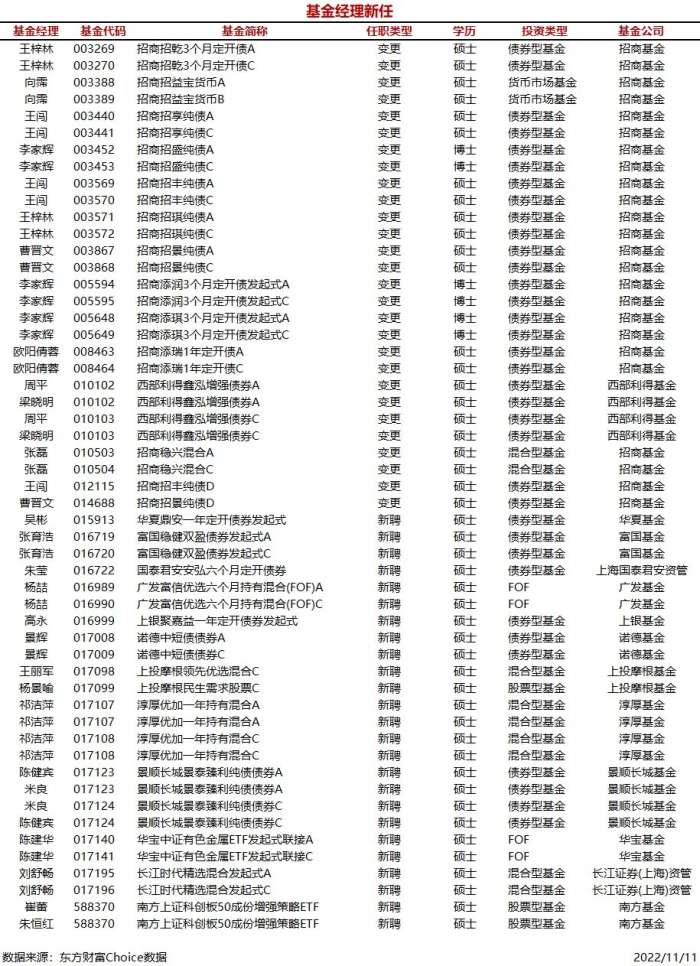 南方财经11月11日电,据东方财富Choice数据统计,今日,新聘基金经理24人,涉及基金53只(A/C类分开计算),主要来自招商基金等公司。另外,招商基金今日有1位基金经理离任,涉及20只基金。