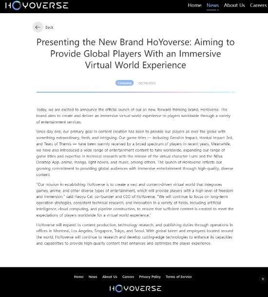 对于创立该品牌,HoYoverse联合创始人兼CEO,米哈游团队联合创始人蔡浩宇表示:“我们成立HoYoverse的使命是打造一个由内容驱动的宏大虚拟世界,游戏、动画和其它多种娱乐类型在这里融合,为玩家提供高自由度和沉浸感。我们将继续专注长线运营策略,持续开展技术研究,在人工智能、云计算和工业化能力搭建等方面不断革新,以确保创造出足够的内容来满足全球玩家对虚拟世界体验的期待。”(21世纪经济报道)