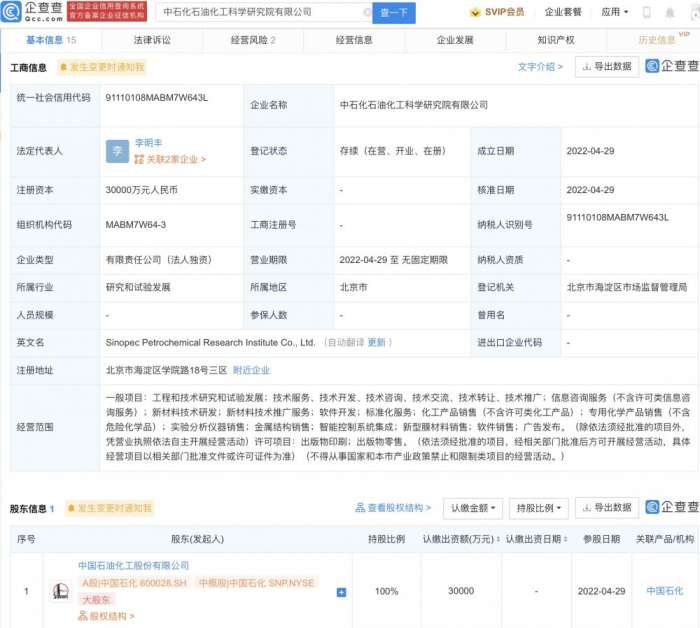 南方财经5月5日电,企查查APP显示,4月29日,中石化石油化工科学研究院有限公司成立,注册资本3亿元,经营范围包含:实验分析仪器销售;金属结构销售;智能控制系统集成;新型膜材料销售等。股权穿透显示,该公司由中国石化100%控股。