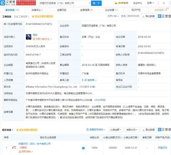 阿里巴巴广东公司注册资本增加至35亿,增幅3400%